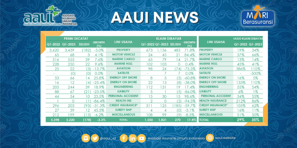 Asosiasi Asuransi Umum Indonesia (AAUI) melaporkan pada Konferensi Pers yang diselenggarakan pada Selasa, 30 Mei 2023 pembukuan premi industri asuransi umum untuk periode Triwulan-I 2023 mengalami pertumbuhan sebesar 16,4% y-on-y dibandingkan periode yang sama di tahun 2022.